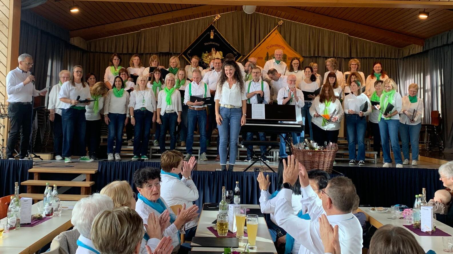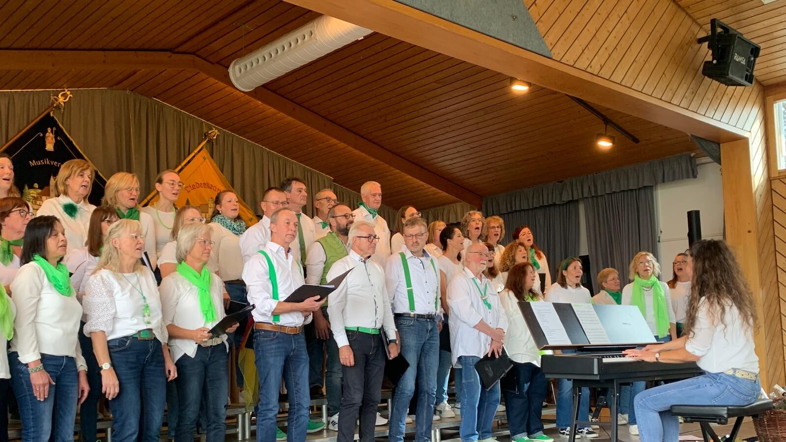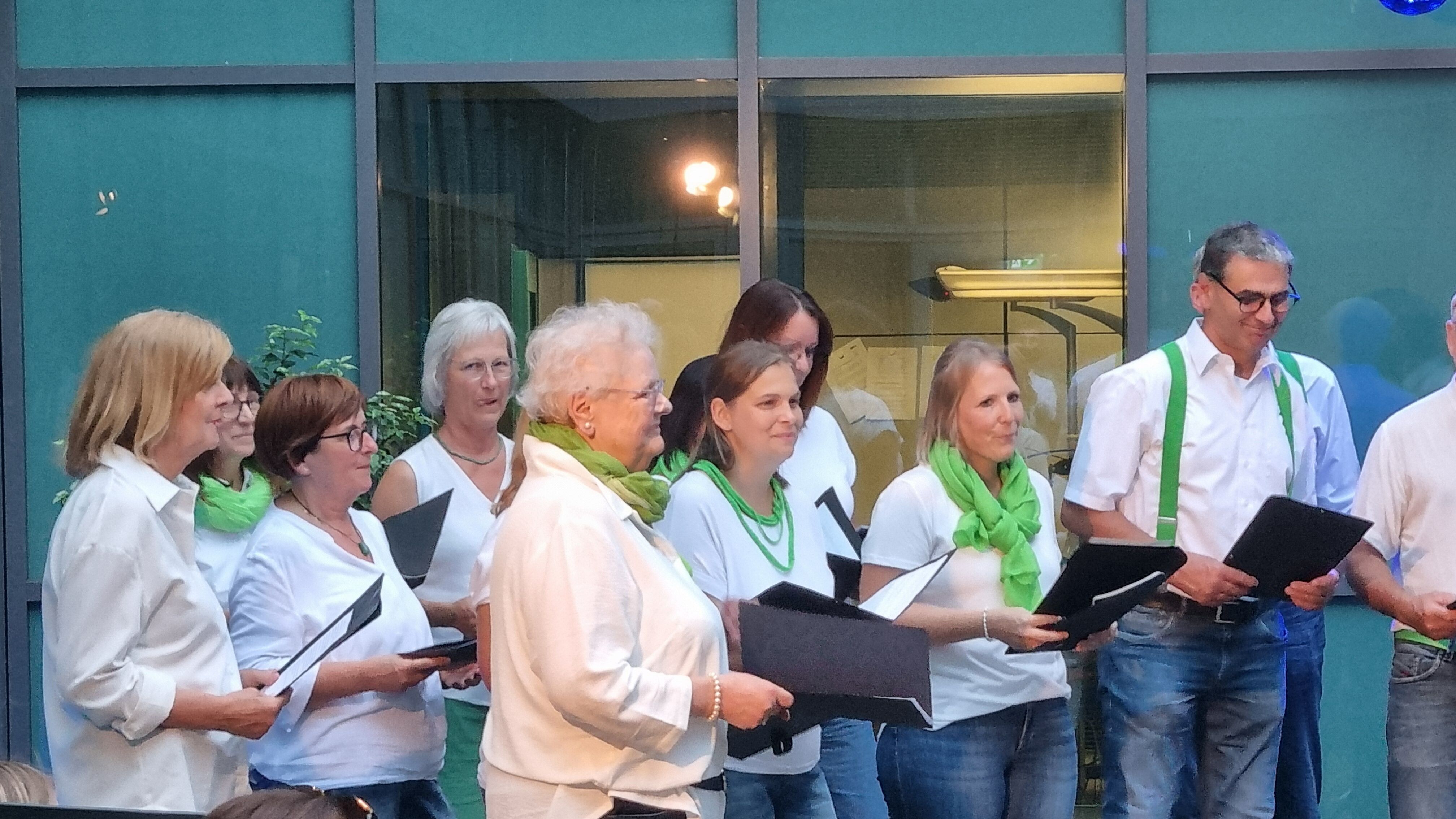 Chorleiterin Uli Marquart führte mit lustigen Tänzen, Percussions und Stimmübungen ein und verlangte dem fEinklang in insgesamt 6 Proben viel ab, aber immer mit Humor, guter Laune und Feingefühl. Toll, dass der Chor mit 45 Sängerinnen und Sängern fast vollzählig war.ei